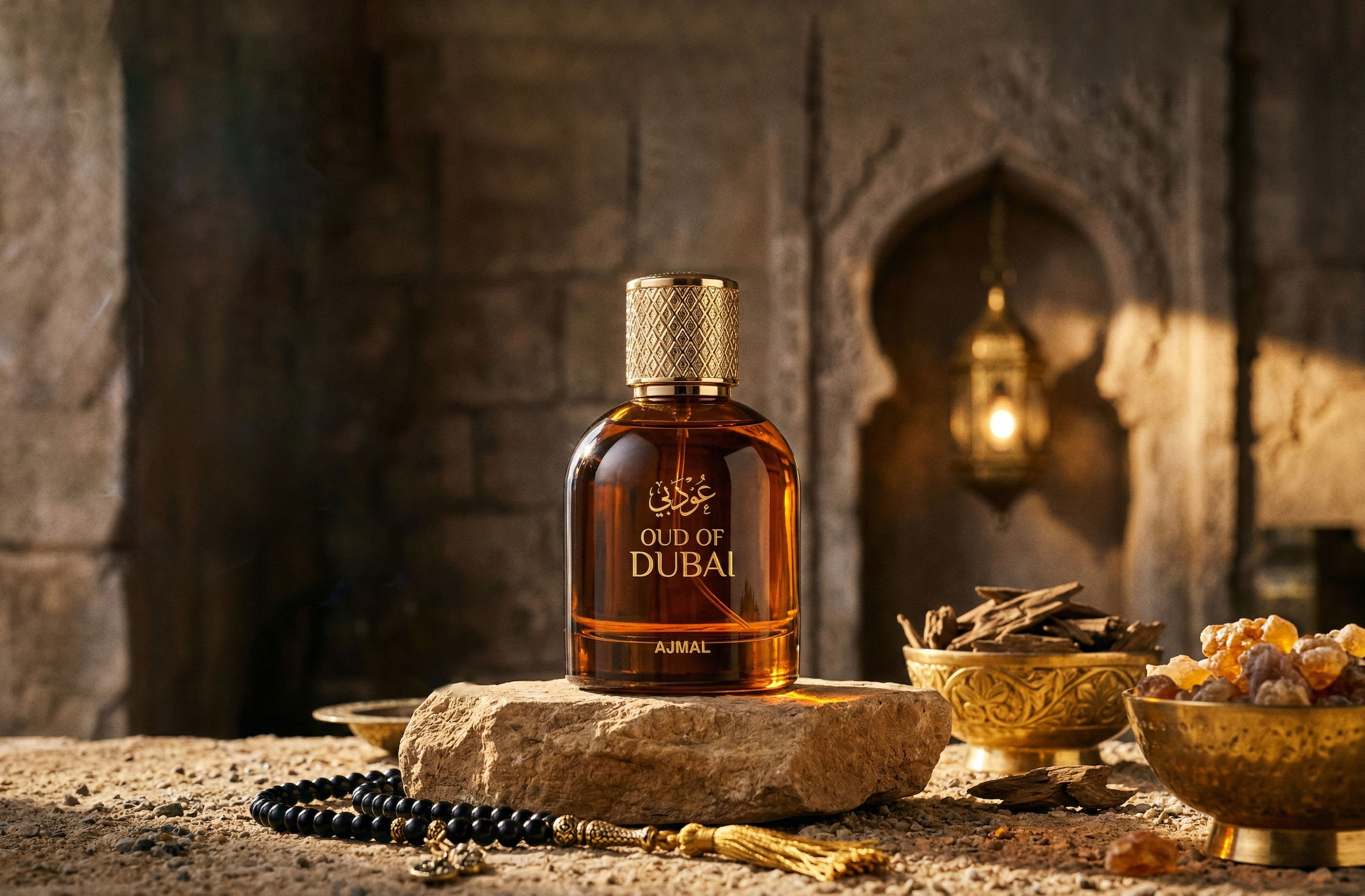一个奢华的深琥珀色玻璃香水瓶,瓶身圆润饱满且具有厚重感,液体晶莹剔透。瓶盖为金色细密菱格纹金属材质。瓶身印有金色艺术字体“OUD OF DUBAI”和“AJMAL”。瓶子稳稳地放置在粗糙的浅棕色天然原石台座上。