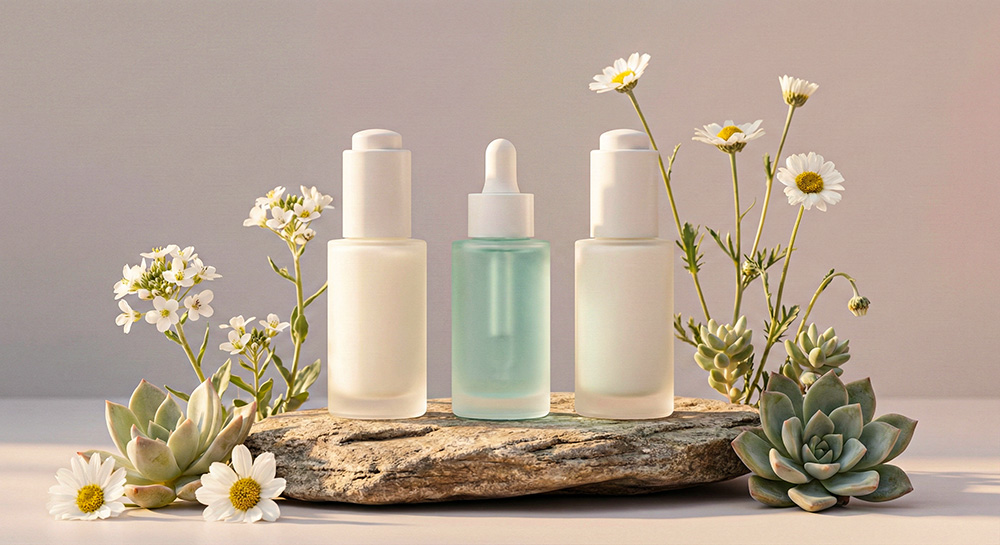 完美广告摄影,构图精巧。两瓶磨砂象牙白精华液瓶与一瓶磨砂浅绿松石色油瓶置于风化沙漠石上,周围点缀着白色小花与沙漠多肉植物。背景为浅灰粉色,带有微妙渐变。柔和的自然光营造出温暖高光与柔和阴影。高分辨率,焦点清晰,照片级写实商业摄影,兼具极简优雅与有机平衡。