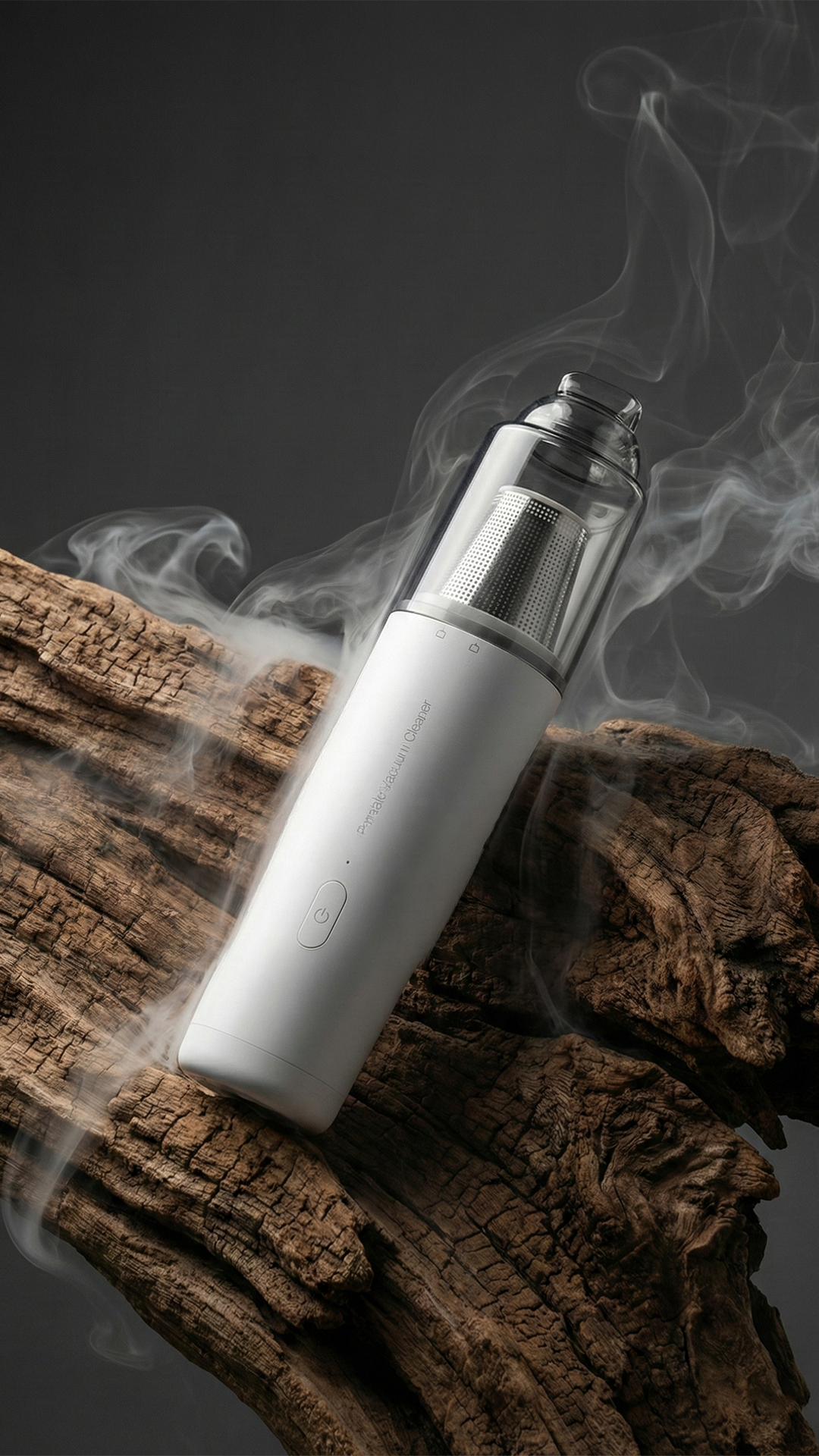 电影级的商业摄影,白色吸尘器斜放在干燥且纹理深刻的深褐色枯木上。背景充满流动的白色轻烟,深灰色极简背景。柔和的聚光灯勾勒出产品边缘,强调极高的细节质感。沉静、冷峻、原始自然与现代工业的结合,超高分辨率,微距细节,大师级光影。