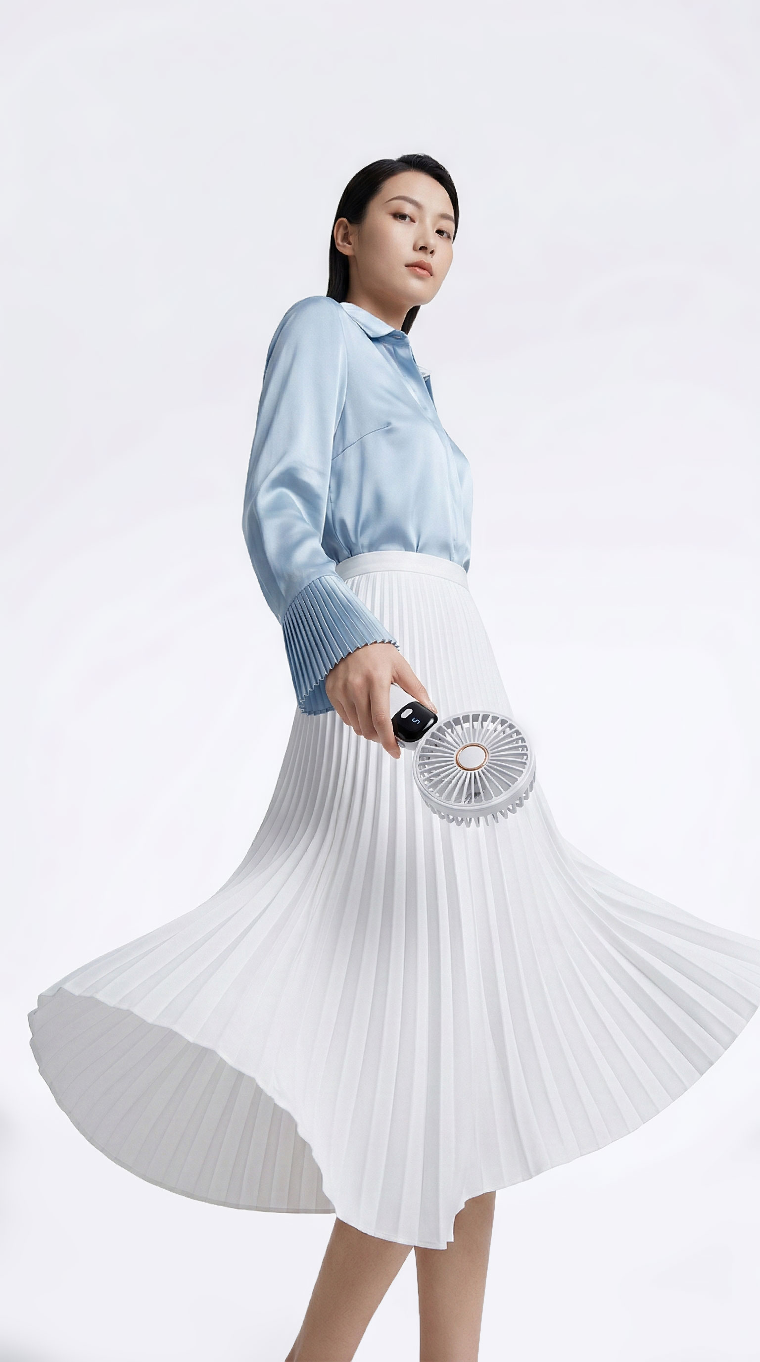 一位气质清冷的亚洲女性,穿着浅蓝色亮面丝绸质感衬衫,袖口带有精致的褶皱设计,下半身穿着洁白的细百褶半身裙,裙摆如扇形般大幅度散开。她单手拿着一台手持风扇,动作自然且富有力量感。