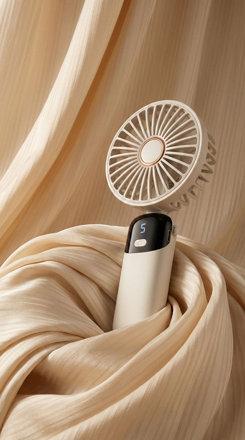 风扇被半掩埋在层层叠叠、富有褶皱感的米黄色高级丝绸面料中,面料带有细微的竖条纹理,质地柔软顺滑。