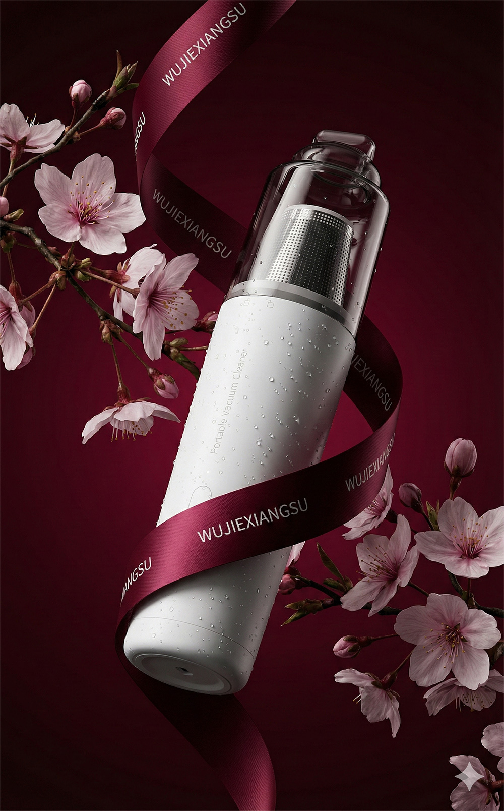 现代美妆风格的产品广告摄影。参考图1悬浮于空中,形成富有动感的构图。细长的酒红色绸缎优雅地缠绕瓶身,绸缎上印有与瓶身相同的重复白色字体”WUJIEXIANGSU”,同时不遮挡包装上的关键文字。瓶体周围点缀着大朵繁茂的樱花枝,为画面增添了层次感和装饰性。采用仰拍角度,瓶身略微倾斜,露出瓶底。