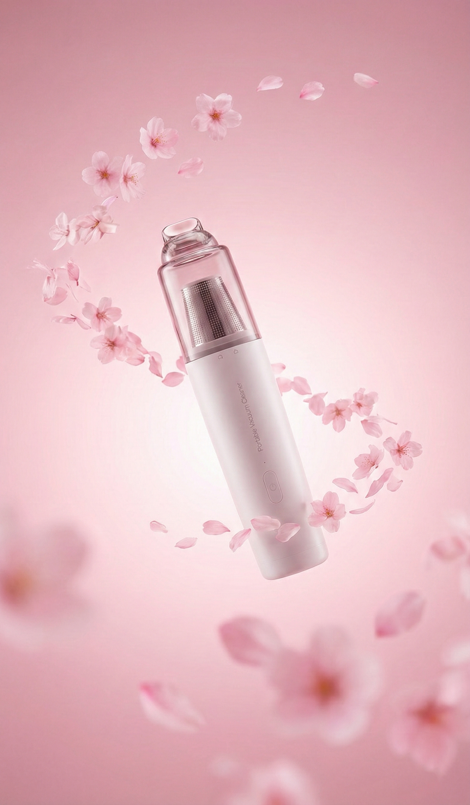 背景是无缝衔接的粉色渐变色调,透着微光;前景中点缀着几片刻意模糊的花瓣,营造出深邃的层次感。柔和且弥散的漫反射光线照亮了整个场景,勾勒出吸尘器洁净的线条,衬托出漂浮花瓣的空灵之美。