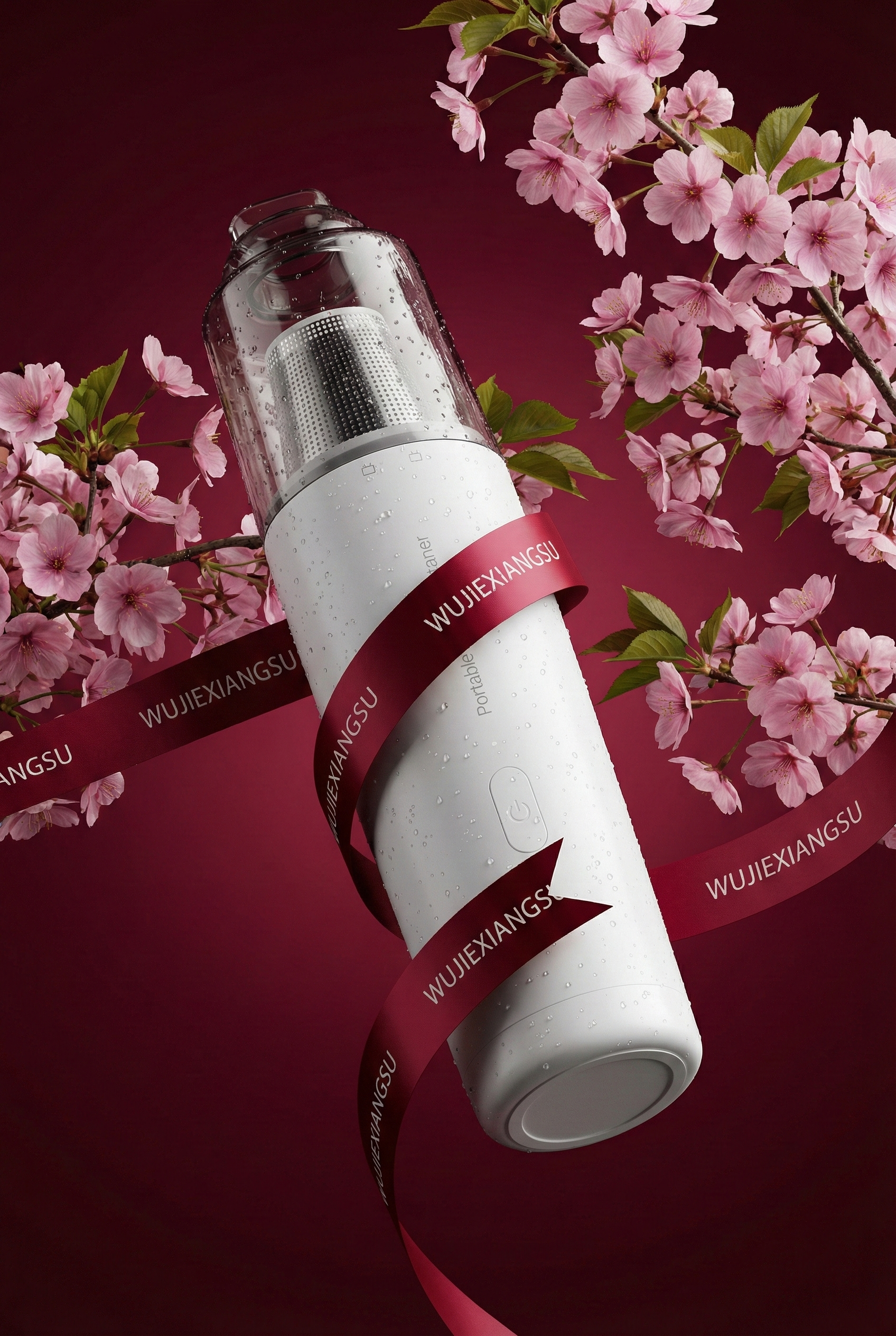 装饰元素: 产品周围环绕着大朵茂密的樱花枝,为画面增添了立体感和装饰性。