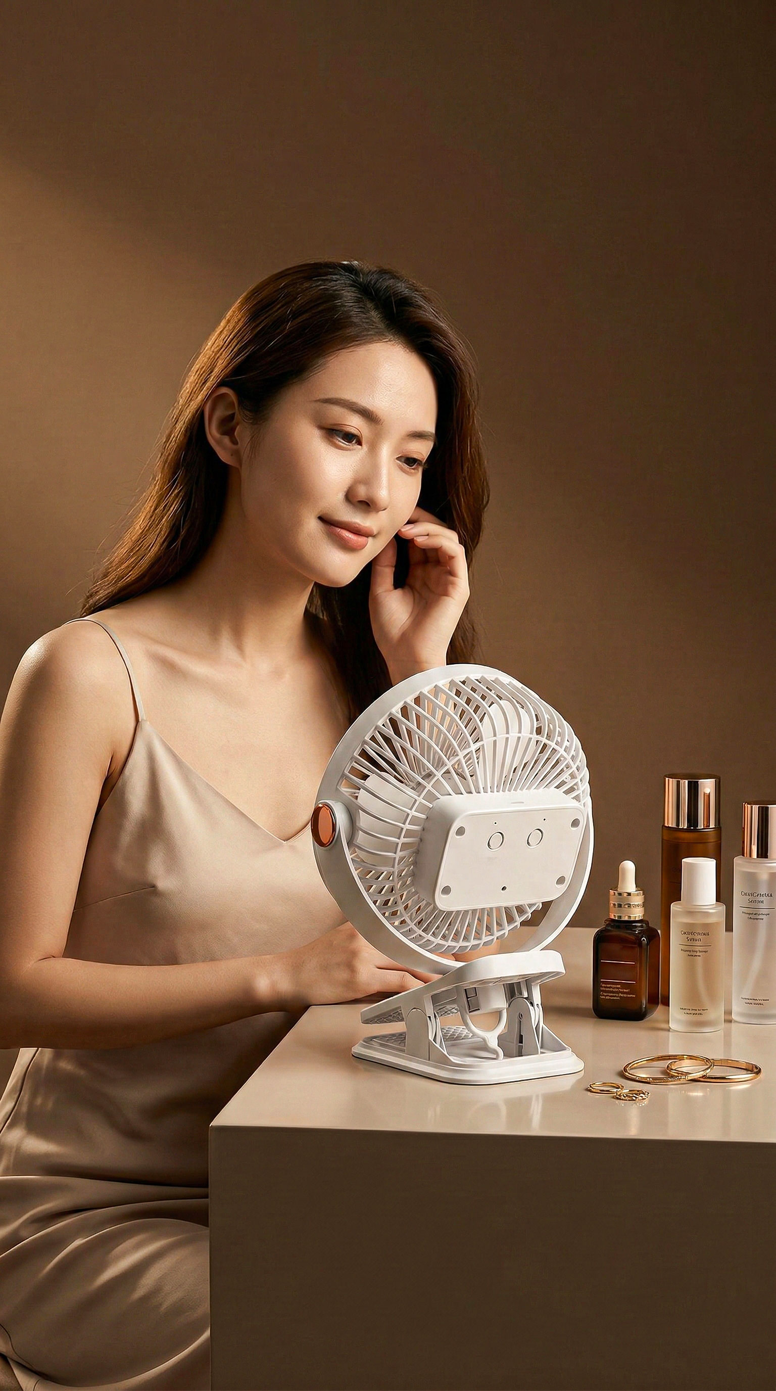 极简风格的化妆台,桌面上整齐摆放着高端护肤品瓶罐、金色的手镯和戒指。核心主体是一台极简主义风格的纯白色桌面小风扇。