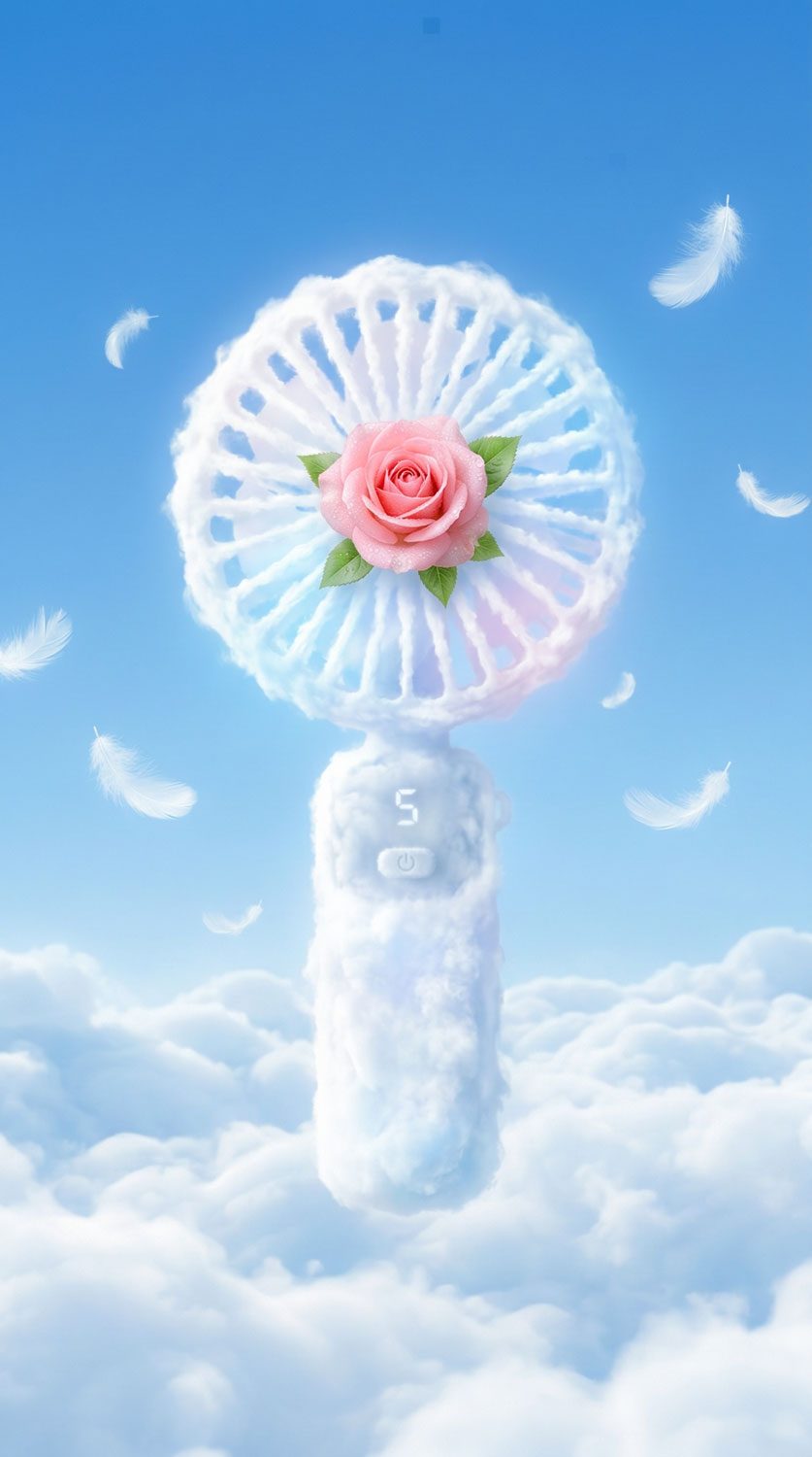一个由洁白、蓬松稀薄白云构成的手持风扇轮廓,悬浮在画面中央。云朵内部隐约透出淡淡的淡蓝色和粉色光泽。云朵主体上点缀着一朵娇艳欲滴、带有露珠的粉色玫瑰花,花瓣质感细腻,伴有绿叶。