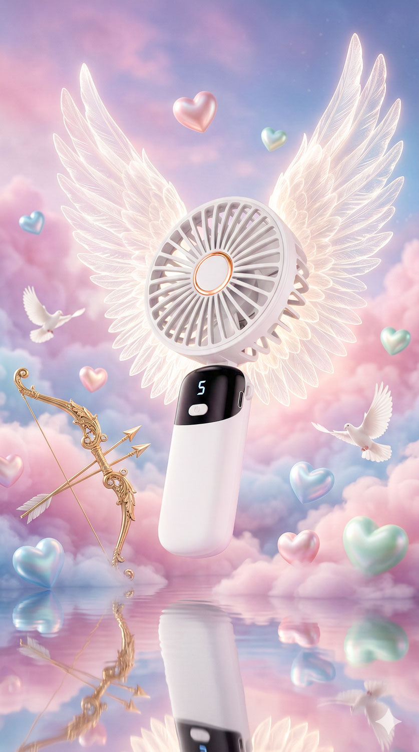 一个简约白色的手持风扇,位于画面中心。产品背后生长出一对巨大的、半透明的白色发光羽翼,羽毛纹理细腻清晰。