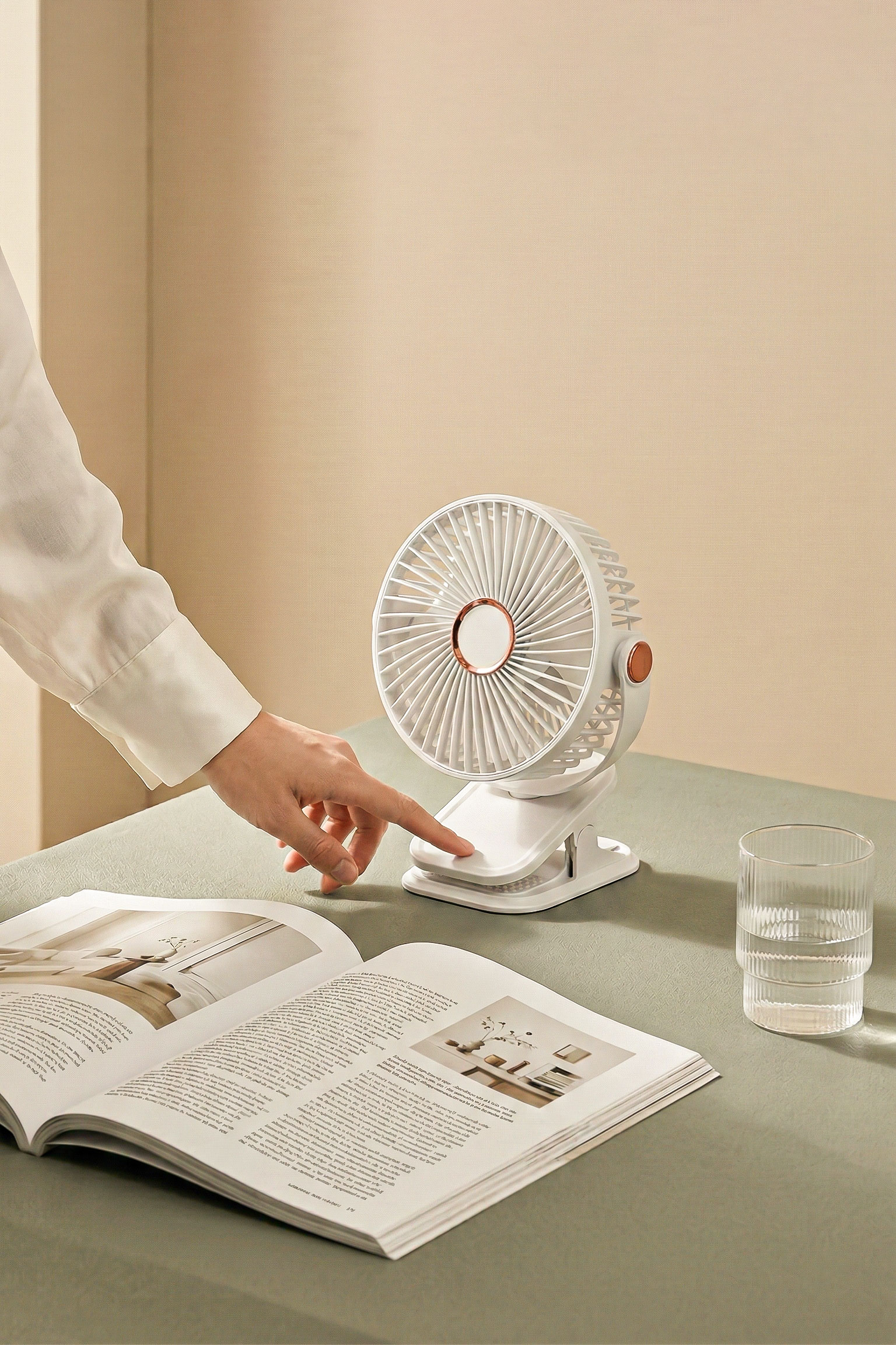 风扇放置在灰绿色的磨砂质感桌面上。桌面上还散落着一本翻开的杂志(带有密集的排版文字)和一个装有透明液体的条纹玻璃杯。背景是干净的米色或浅咖色实墙。