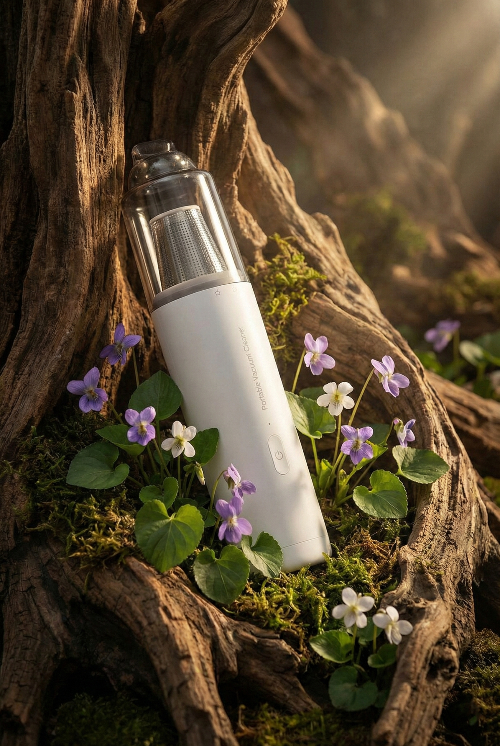 吸尘器被自然地嵌入一段苍老、纹理深邃的棕色枯木根部。木头缝隙中簇拥着盛开的小巧紫罗兰和白色野花,绿色的心形叶片点缀其间。